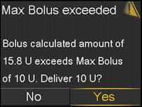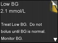 If you’re using the MiniMed® 640G System^, you may receive an alert when performing a bolus, related to either having dangerously low Blood Glucose, dangerously high BG or are trying to deliver a large Bolus™ (as shown in the pictures). It is important that you clear these alerts immediately so that you can correctly deliver the bolus. It is also important to never use data older than 12 minutes to determine a Bolus™ amount.