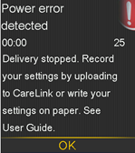Medtronic has identified a software issue that could prevent the internal battery from charging in your pump. Should this software issue occur, an alarm is triggered and you will see the following ‘Power error detected’ message displayed on the pump screen: